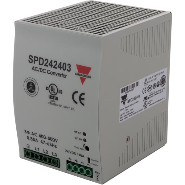 Strømforsyning for 3-fas 350-575 VAC forsyningsspenning. Sekundærspenning 24 VDC. Effekt inntil 240 W. For DIN-skinne montasje. Skrutilkobling. Ikke-modulær utførelse.