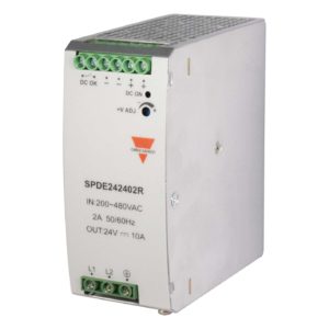 SPDE242402R Strømforsyning. Strømforsyning 2-fase 180-600VAC /24VDC 240W 10A m/rele. For DIN-skinne montasje og skrutilkobling.