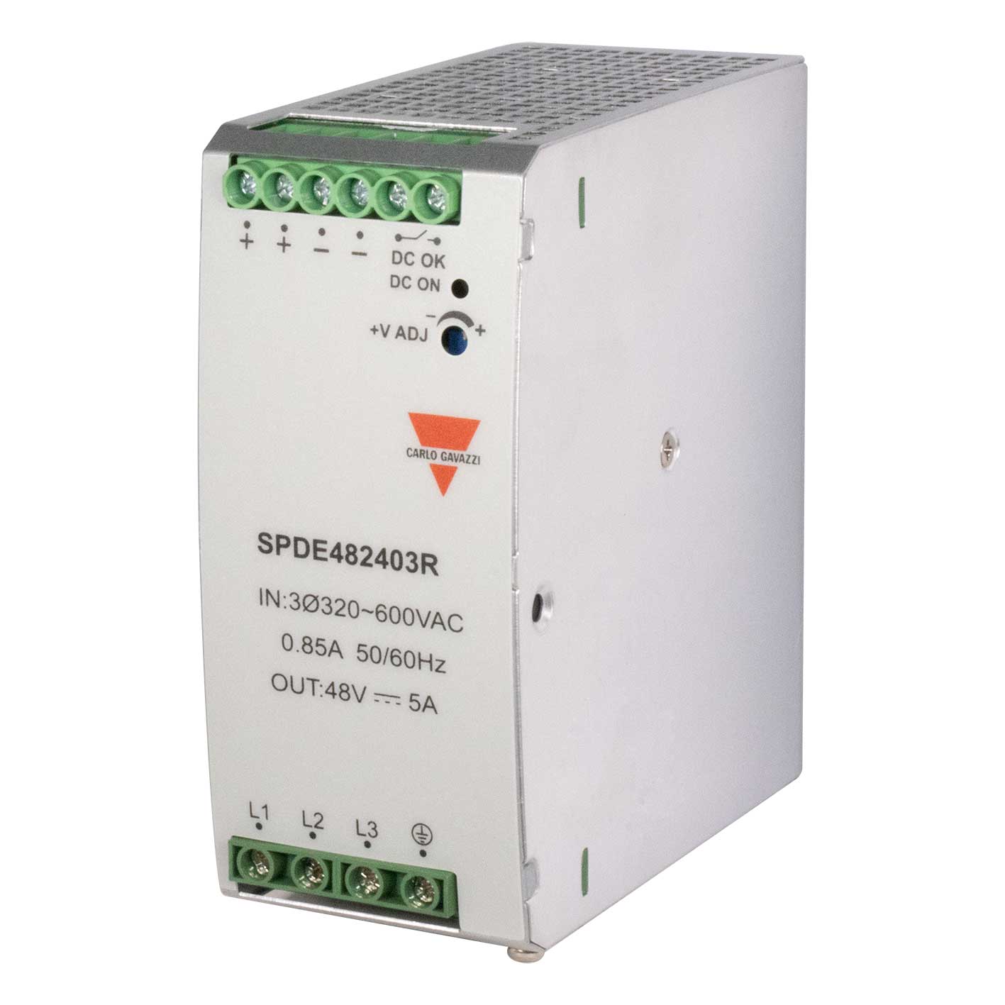 SPDE482403R Strømforsyning. Strømforsyning 3-fase 320-600VAC / 48VDC 240W 5A m/rele. For DIN-skinne montasje og skrutilkobling.