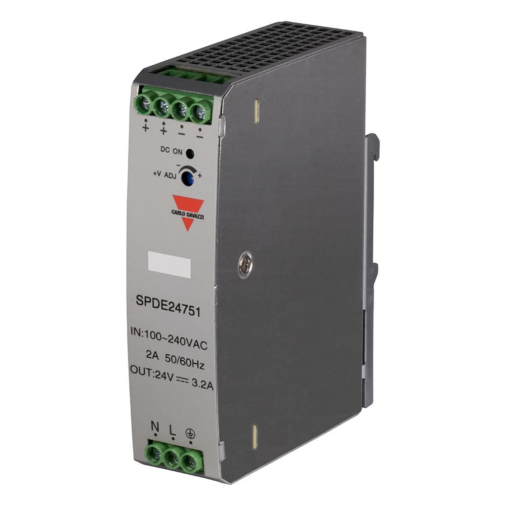 SPDE48751 Strømforsyning. Standard strømforsyning 1-fase 48VDC 1,64A 75W. Ultrakompakt utførelse med skrutilkobling og montering på DIN-skinne. Høy virkningsgrad og bredt temperaturområde -40º til 70ºC. Kortslutnings-, temperatur- og overbelastningsbeskyttet. Forsyningsspenning 100-240 VAC/120-370 VDC.