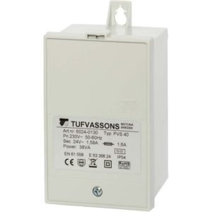 Kapslet dobbeltisolert vernetrafo 230VAC/24VAC 60VA, med sikring for beskyttelse mot kortsluttning og overbelastning