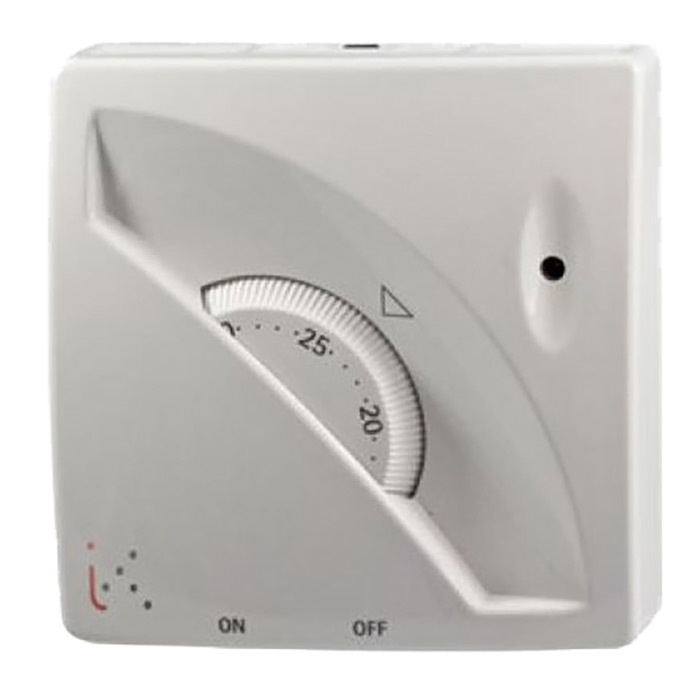 Romtermostat (bimetall) +7…+30 grader Celsius som veksler på utgangen når temperaturen er over/under den innstilte verdi.