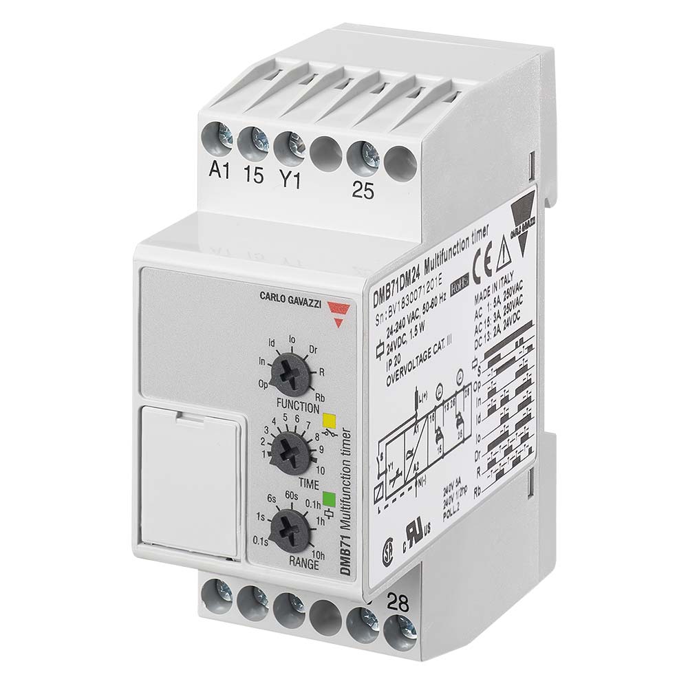 Multifunksjons tidsrelè med en rekke funksjoner som forsinket innkobling, forsinket utkobling, intervall, pulspunksjoner, taktgiver og blinkfunksoner. Valgbart tidsområde 0,1s-100t. Multispenning 24VDC/24-240VAC. -releutganger. Modulærutførelse med byggebredde 1-modul.