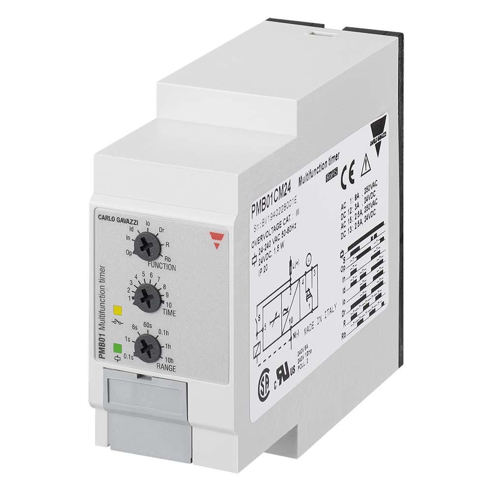Multifunksjons tidsrelè med en rekke funksjoner som forsinket innkobling, forsinket utkobling, intervall, pulspunksjoner, taktgiver og blinkfunksoner. Valgbart tidsområde 0,1s-100t. Multispenning 24VDC/24-240VAC. 1 releutgang. For 11-pins sokkel.