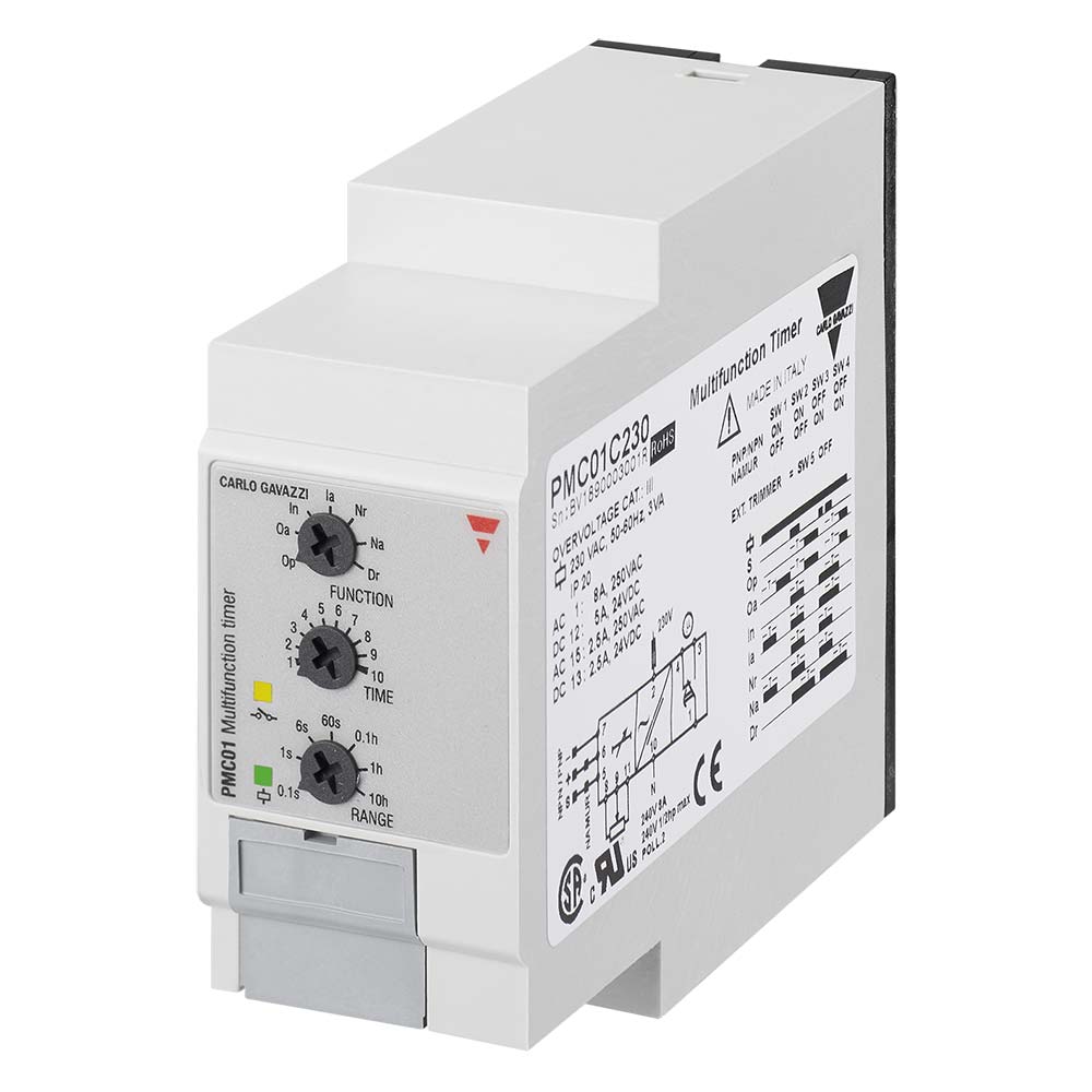 Multifunksjons tidsrelè med en rekke funksjoner som forsinket innkobling, forsinket utkobling, intervall, pulspunksjoner, taktgiver og blinkfunksoner. Avansert utførelse med mulighet for tilkobling av ekstern giver NPN/PNP/NAMUR. Mulighet for å benytte fjernpotensiometer. Valgbar funksjon og valgbart tidsområde 0,1s til 100t. Hjelpespenning 115VAC. 1 releutgang. For 11-pins sokkel.