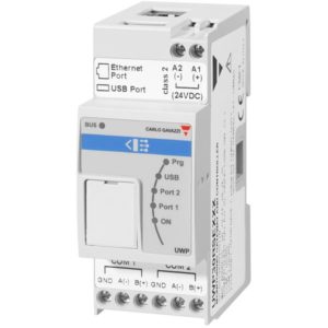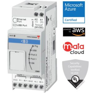 UWP30RSEXXXSE Controller. Universal WEB basert controller UWP, for DIN-skinne montering, 2 moduler, 15-24VDC forsyningsspenning. UWP30RSEXXX har intern lagringskapasitet på 3 Gb for lagring av energidata og analoge data. Controlleren har også mange avanserte funksjoner som gjør at den er velegnet til å utføre avanserte styringer. Controlleren blir ofte brukt til lysstyringssystemer med DALI. Enheten kan og tilkobles alle nettanalysatorer og energimeter fra Carlo Gavazzi, samt lagre og logge alle typer analoge verdier. Enheten har integrert BACnet TCP/IP og Modus TCP/IP protokoller. Den er også Microsoft Azure og AWS sertifisert for IoT. Protokoller som MQTT og rest API er integrert. UWP3.0 systemet kan bygges sammen med alle øvrige Smart Dupline komponenter. Denne utgaven har utvidet Cyber security i henhold til IoT og er en av få WEB baserte controllere som har oppnått silver rating i UL.