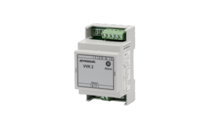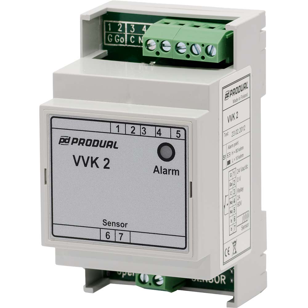 Vannlekkasjerele i modulærutførelse. Forsyning 24VAC/DC. Beskyttelsesgrad IP20. VVK2 overvåker status for vannlekkasjesensoren som er koblet til releet. Når sensoren blir våt minskes motstanden, og alarmreleet aktiveres. Sensorkretsløpet overvåkes også (alarm hvis R > 330 kΩ. For DIN-skinne montering.