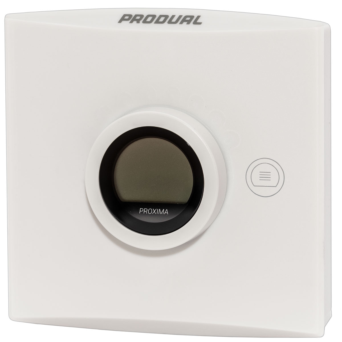 Trådløs romføler. Temperatur, CO2 og RH med forstilling, display og meny. Hvit utførelse. Inngår i Produals nye Proxima-serie av romenheter og romkontrollere som finnes i både trådbundne og trådløse utførelser. Enhetene er basert på Produals PUMP-konsept (Produal Unified and Modular Plattform) som er basert på Plug-n-Play med enkel trådløs oppdatering og konfigurering av produktene.