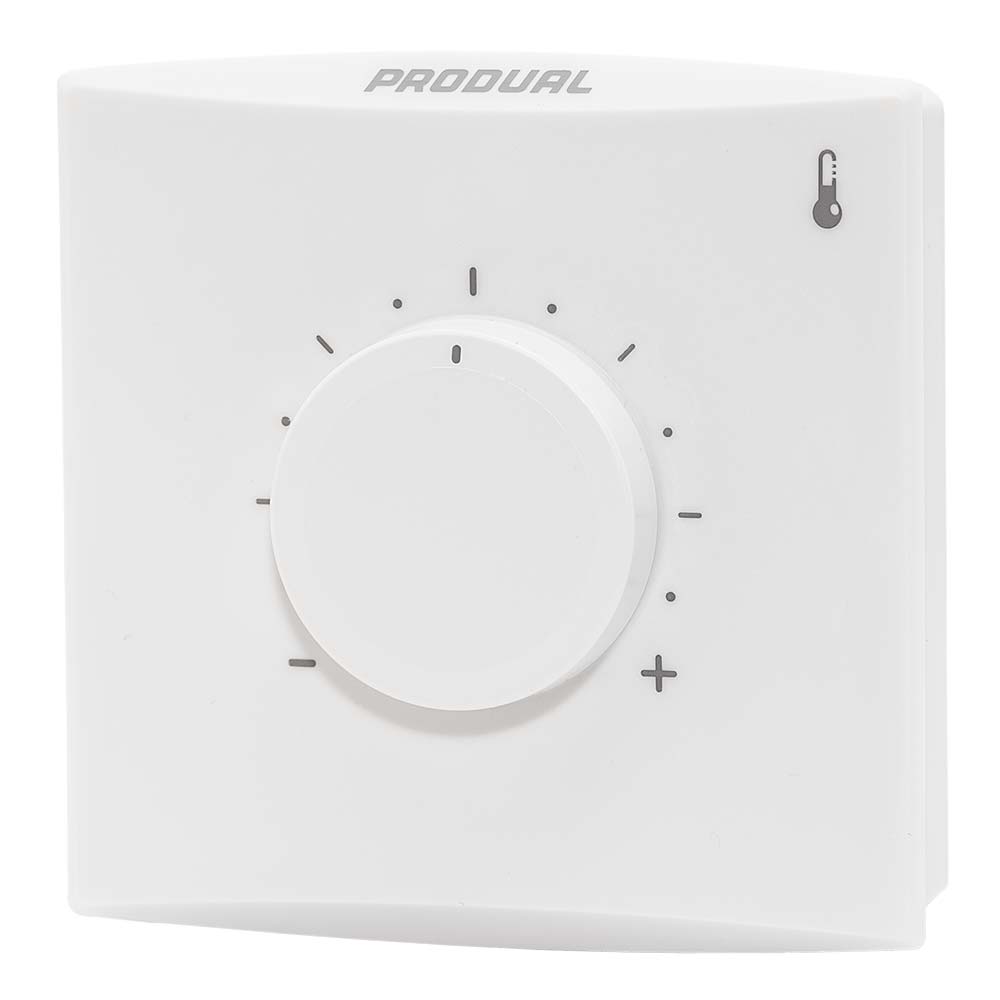 Trådløs romføler med forstilling. Hvit utførelse. Inngår i Produals nye Proxima-serie av romenheter og romkontrollere som finnes i både trådbundne og trådløse utførelser. Enhetene er basert på Produals PUMP-konsept (Produal Unified and Modular Plattform) som er basert på Plug-n-Play med enkel