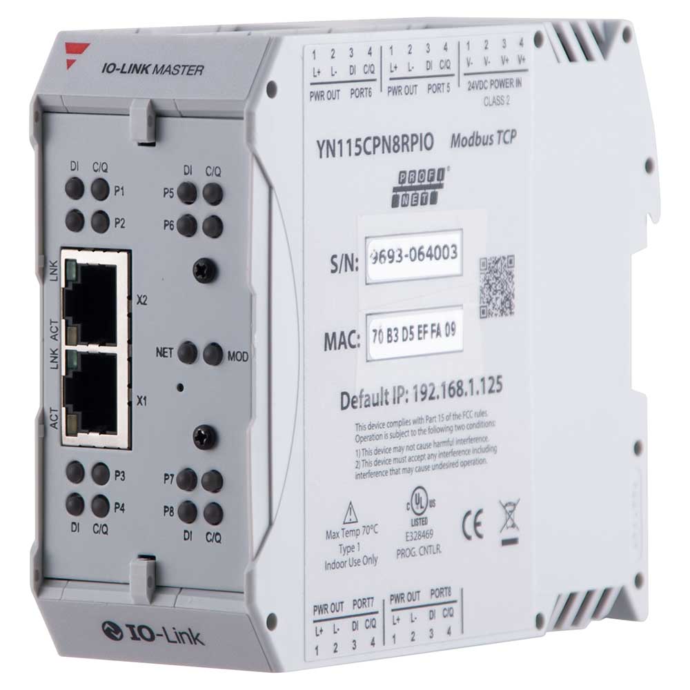 YN115CPN8RPIO IO-Link Master. IO-Link Master med 8 porter for tilkobling til 8 givere. For DIN-skinne montasje, med skrutilkoblinger. PROFINET IO, Modbus TCP, OPC UA grensesnitt. Integrert WEB-server. 2 Ethernet porter med RJ45. Multifarge LED-for statusindikering.