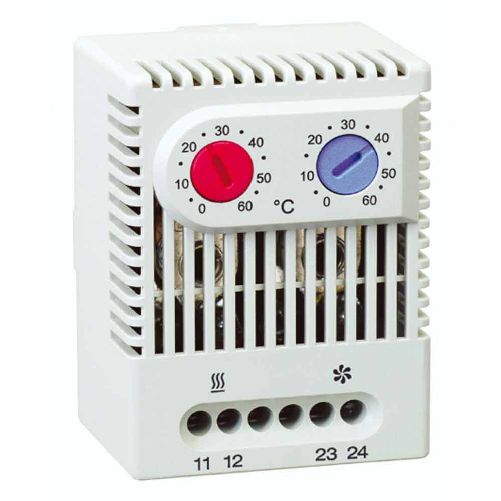 Dobbel termostat med justerbart temperaturområde 0-60 °C for både varme- og kjølefunksjon. IP20. DIN-skinne montering. Stego.