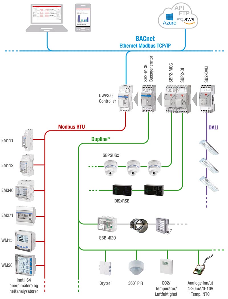Systemet baserer seg på Smart Dupline 2-leder feltbuss og controlleren UWP3.0. Controllerens integrerte og brukervennlige web-server kan enkelt utveksle data med andre systemer via Modbus, BACnet, FTP, SFTP, FTPS, SMTP, Rest API og MQTT.
